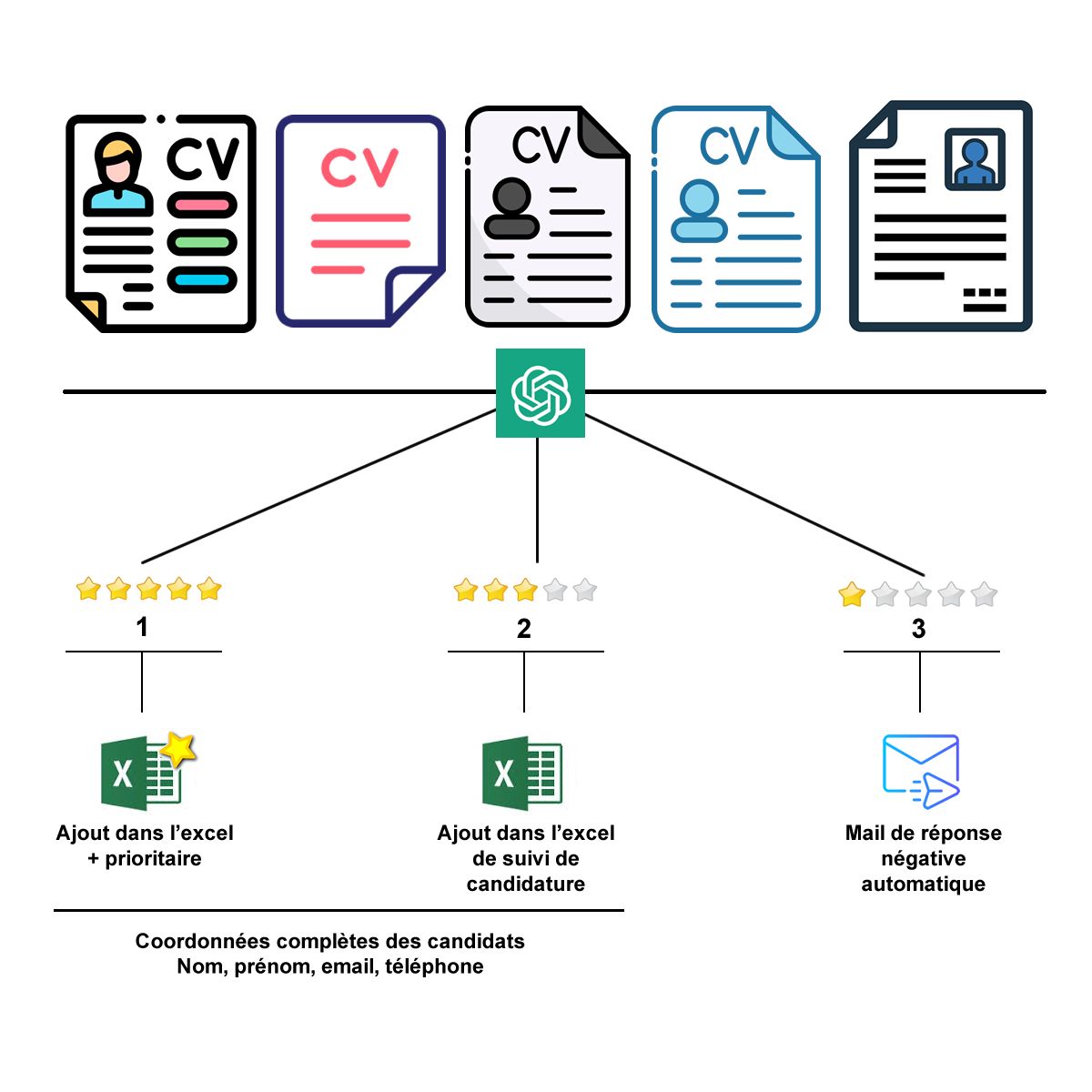 ⭐⭐⭐⭐⭐ : Les meilleurs profils sont directement mis en priorité et ajoutés à un fichier de suivi pour un traitement rapide.